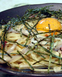 全体に黒胡椒とノリをちらし、卵黄を中央にのせる。
