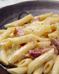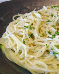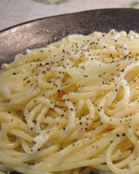 ソースが固まらないうちに、ゆでたスパゲッティをからめて、皿にもる。