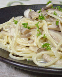 キノコがしんなりしたら、白ワインをふりかけて強火にして、