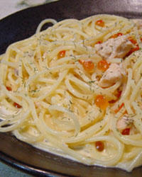イクラを加えて軽く熱を加え、ゆでたスパゲッティをからめる。