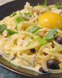 塩で味を調え、ゆでたスパゲッティをからて盛り付ける。