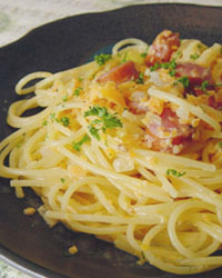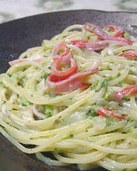 塩で調味して、ゆでたスパゲッティを加えて皿にもりつける。