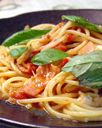 ゆでたスパゲッティをくわえ、モッツレラチーズをちらす。