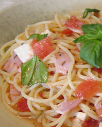 トマト、ハム、モッツレラチーズをいれて塩少々で味を調える。