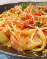 塩胡椒で味を調え、ゆでたスパゲッティをからめて皿にもる。