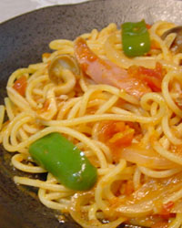 ゆでたスパゲッティをくわえてからめ、皿にもる。