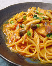 ゆでたスパゲッティをからめて皿にもり、きざんだ葉ネギをちらす。