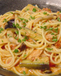 ゆでたスパゲッティ-をからめて皿にもりつける。