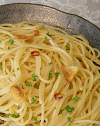 ※ニンニクはオイルが冷たいうちからいためます(じっくりと炒めれば炒めるほど、それだけニンニクの旨みと香りがオイルに伝わるから)。 | |