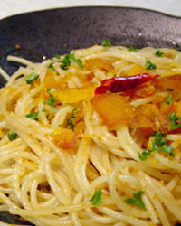※ニンニクをこがしてしまうと(狐色にしてしまうと)、ソースとなるオイルが独特な苦味をもってしまいます。もしここで失敗したと思ったなら、いさぎよくオイルごと捨てて、はじめからやり直したほうがよいです。