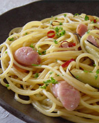 ゆでたスパゲッティ-をからめて皿にもりつけ、パセリを散らす。