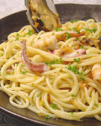 ゆでたスパゲッティをいれて、よくからめてもりつける。