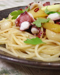ジャガイモの表面が色づいてきたら、 たこと唐辛子とローズマリーの葉をいれて軽くいためる。