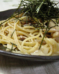 スパゲッティをからめて皿にもりつけ、きざみのりをちらす。