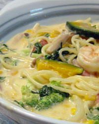 牛乳と生クリームで調整してください。スープで飲むのと同じくらいの濃さが適当です。