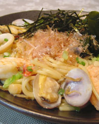 ゆでたスパゲッティをからめ、皿に盛りつける。