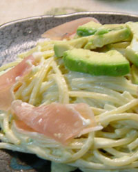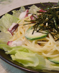 スパゲッティとズッキーニを、ゆで汁をよくきってから、