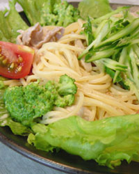 水をよくきって、ソースをいれたボールにいれてよくあえる。