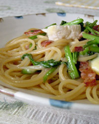 ゆでたスパゲッティとカマンベールをからめて、皿にもりつける。
