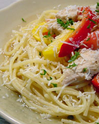 ソースを作る。オリーブオイル30ccでニンニクをいため、少し色づいてきたらアンチョビもいためる。